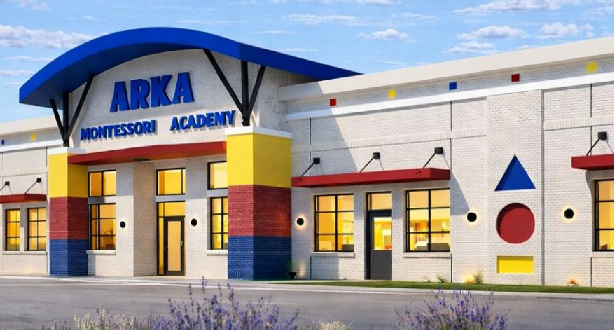 Arka Montessori is a 13,000-square-foot purpose-built educational facility at 1201 W. San Gabriel Parkway, featuring contemporary brick architecture with bold accent detailing.